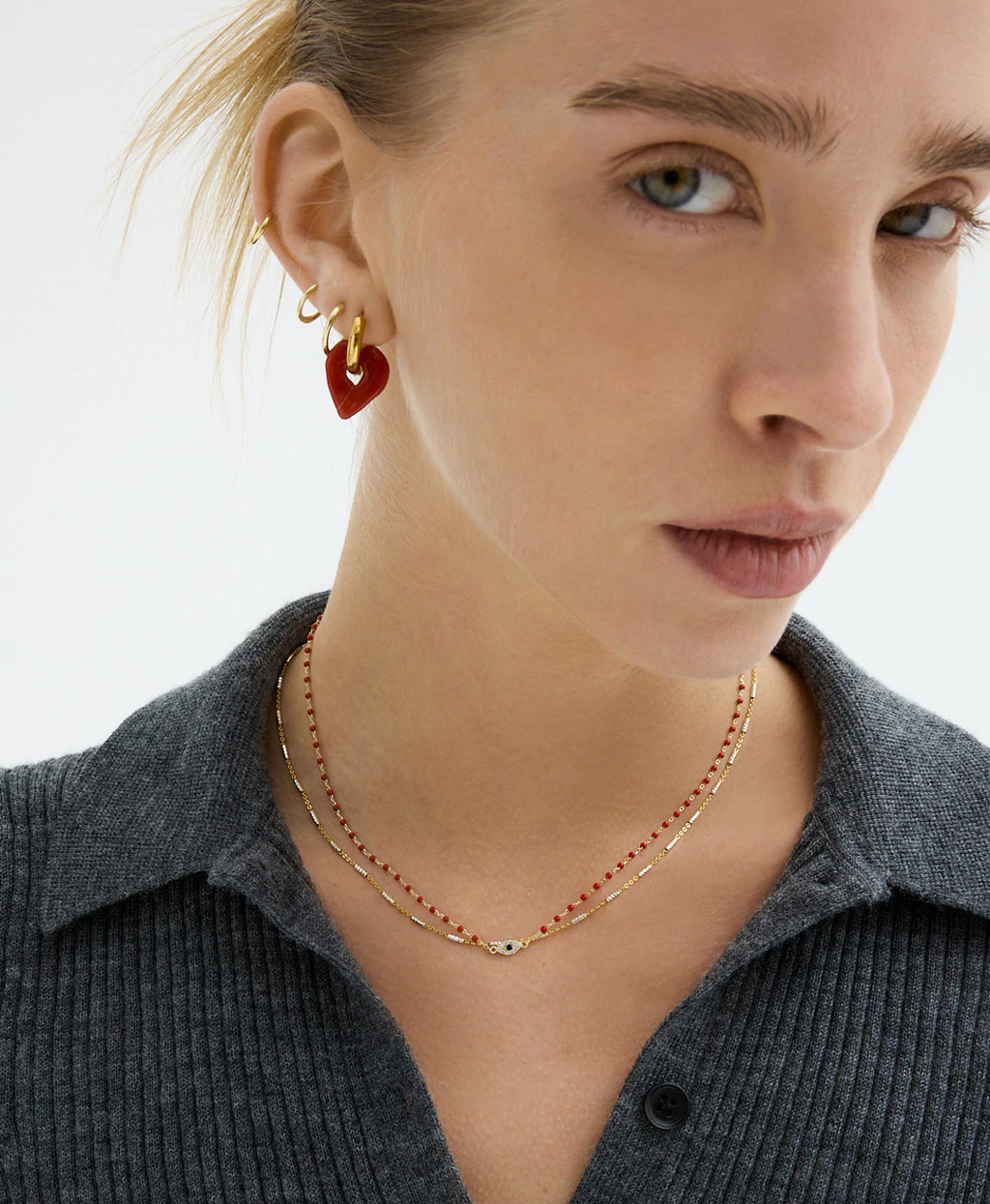 Collar de cadena con cuentas esféricas color rojo en todo el recorrido y detalle de dije en forma de ojo con cristales engarzados.